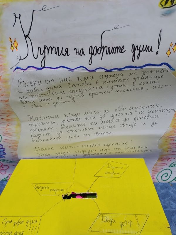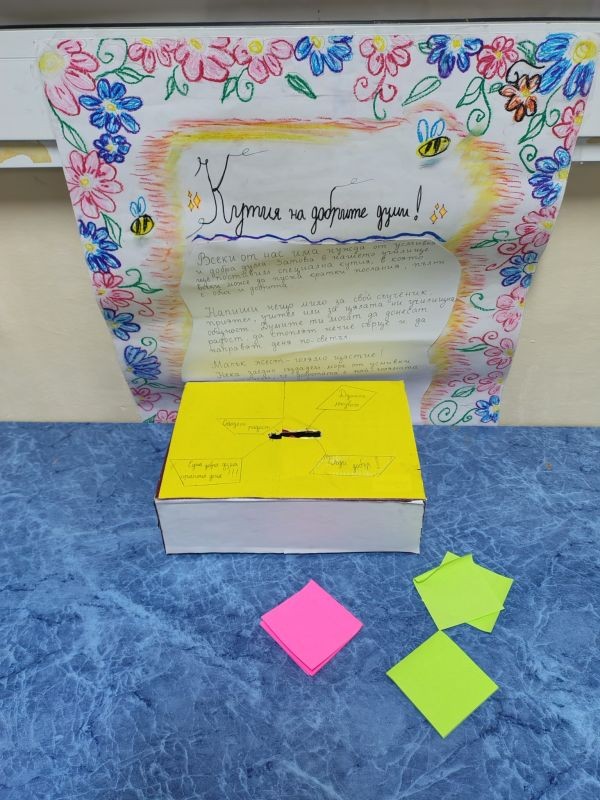 Затова в нашето училище поставихме „Кутия на добрите думи“, в която всеки ученик може да пусне кратко послание към свой съученик, приятел или учител – думи, пълни с обич, подкрепа и доброта.
