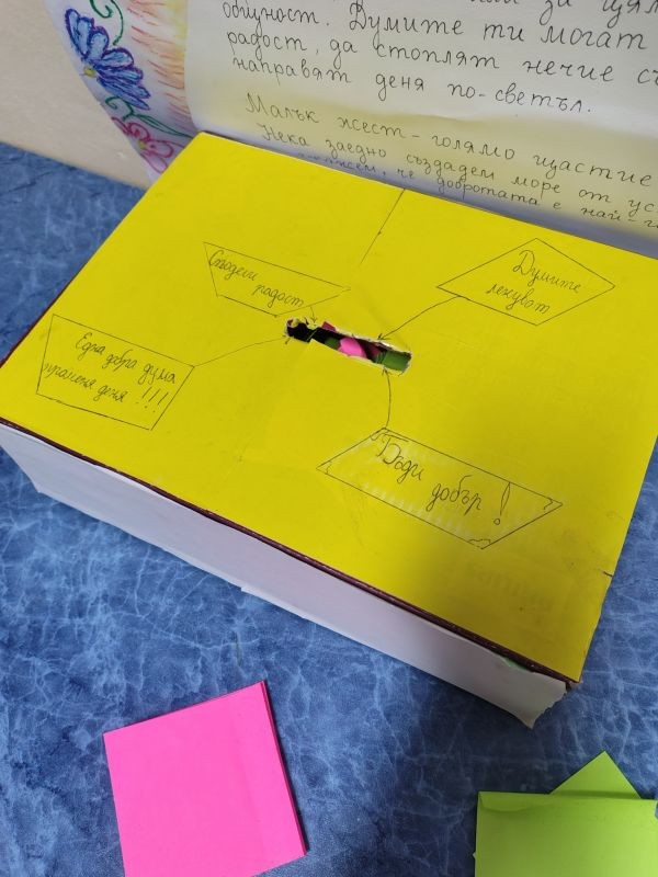 Затова в нашето училище поставихме „Кутия на добрите думи“, в която всеки ученик може да пусне кратко послание към свой съученик, приятел или учител – думи, пълни с обич, подкрепа и доброта.