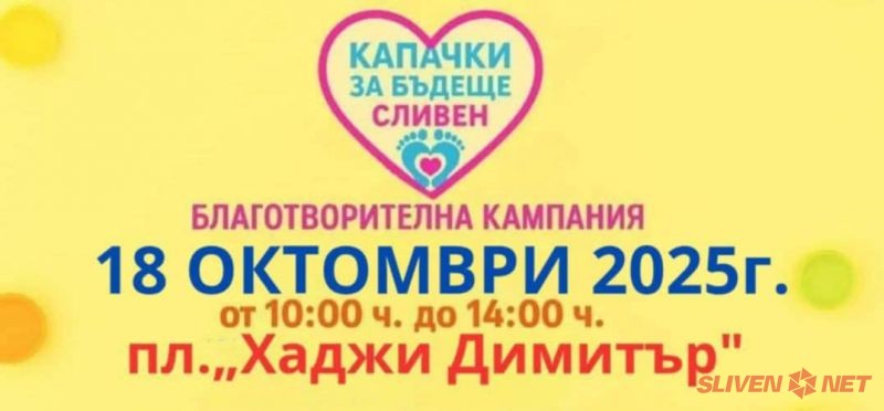 Клуб за Бъдеще – Сливен“ кани всички жители на града на 18 октомври 2025 г. (събота) от 10:00 до 14:00 ч. на площад „Хаджи Димитър“ за участие в традиционната благотворителна кампания за събиране на пластмасови капачки и алуминиеви кенчета.