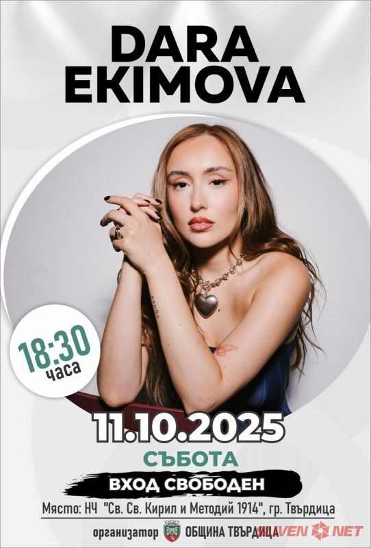 Чаровната и талантлива Дара Екимова ще зарадва жителите и гостите на Твърдица с незабравим концерт, изпълнен с музика, емоции и положително настроение. Събитието ще се състои на 11 октомври 2025 г. (събота) от 18:30 ч. в салона на НЧ „Св. Св. Кирил и Методий 1914“ – гр. Твърдица.