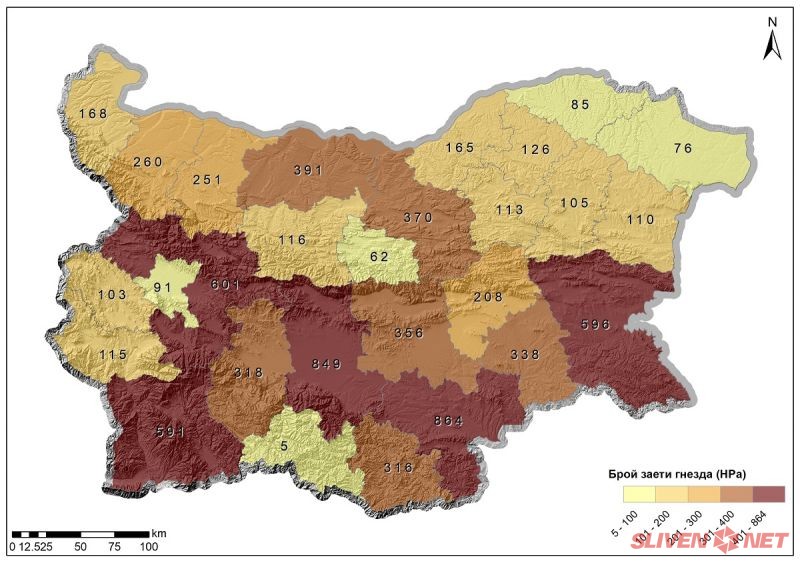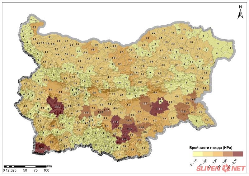 Населените места с най-много заети щъркелови гнезда в България са: село Баня (община Разлог) – 51, село Рупите (община Петрич) – 50, село Райово (община Самоков) – 48, град Бургас – 48, село Драгушиново (община Самоков) – 46 и село Кулата (община Петрич) – 46. Населените места с най-голям общ брой гнезда в страната са: град Бургас – 59, село Драгушиново – 58, село Райово – 56, село Баня – 55, село Белозем (община Раковски) – 52, село Белчин (община Самоков) – 51 и село Рупите – 51.