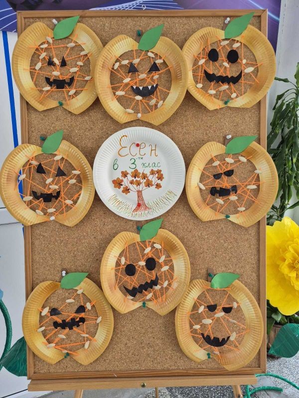 Децата изработиха пъстра есенна украса – дървета от изсушени листа, весели тиквички от картонени чинии и паяжини от прежда.