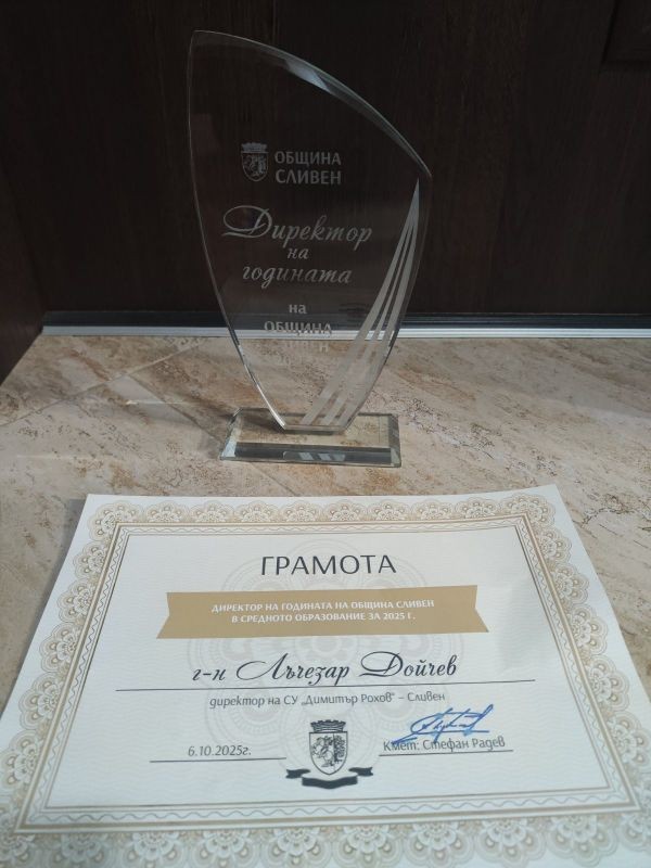 С радост и гордост споделяме, че нашият директор - г-н Лъчезар Дойчев, получи лично от кмета Радев, престижната награда “Директор на годината в средното образование” за 2025г. Тази награда е израз на дълбоко уважение, признателност за професионализма и отдадеността на г-н Дойчев към Спортното училище.