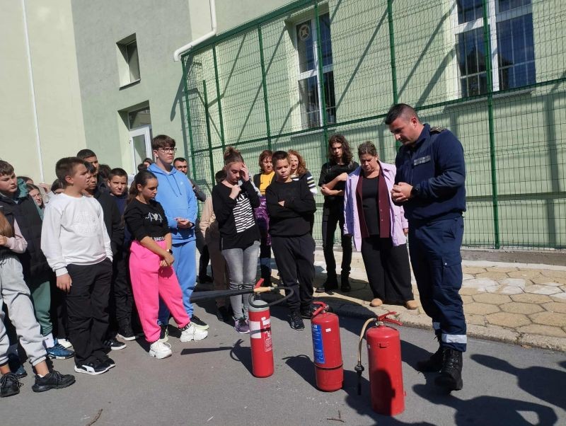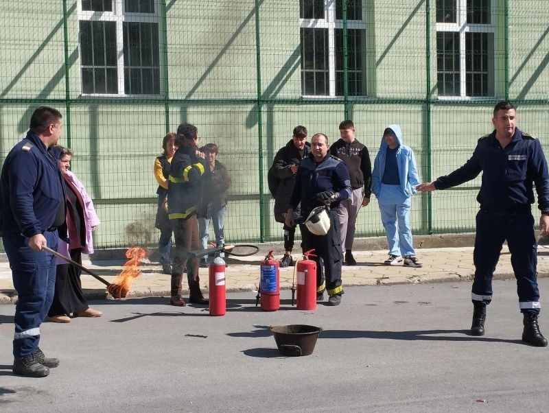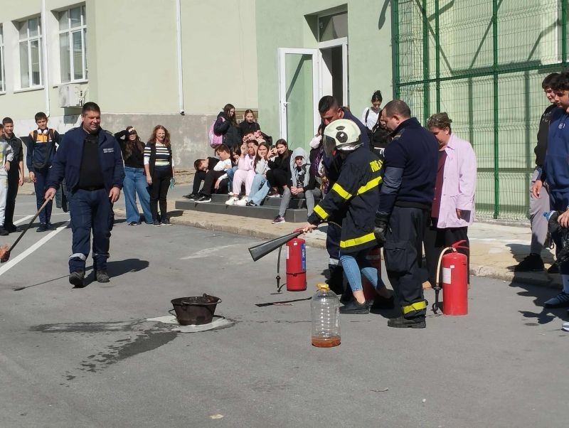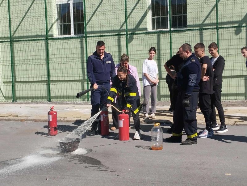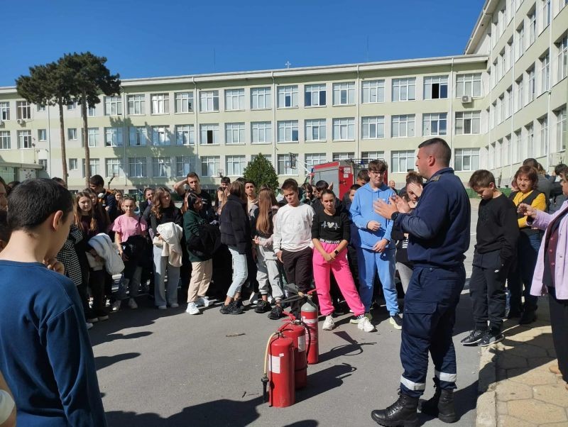 На 10 октомври, в самия край на учебните часове, учениците и учителите от Хуманитарната гимназия проведоха учебна тревога – евакуация от класните стаи в случай на пожар. Благодарим за съдействието на РСПБЗН, които се отзоваха на поканата ни и направиха планираното занятие интересно и полезно за всички. Огнеборците направиха кратко представяне на видовете пожарогасители, които се ползват в обществените сгради, и обясниха как и кога трябва да бъдат използвани. Демонстрацията с гасене на пламък с помощта на различни видове пожарогасители се оказа изключително интересна и за учениците, и за служителите на гимназията.