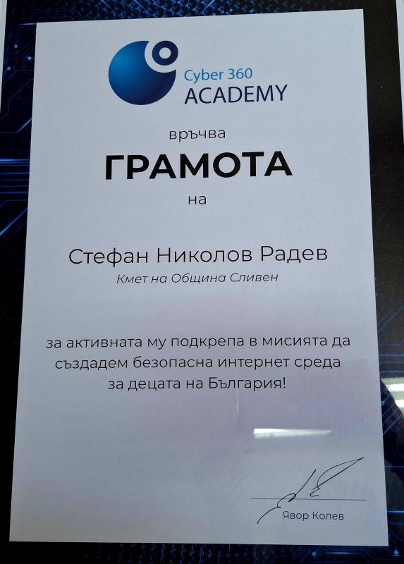 Признание за активната подкрепа в мисията, посветена на осигуряването на безопасна интернет среда за децата на България, получи кметът на община Сливен Стефан Радев. Грамотата е от международно признатия експерт в сферата на киберсигурността Явор Колев, който е бивш директор на Главна дирекция „Борба с организираната престъпност“ /ГДБОП/. Колев е управител на единствената българска кибер академия, която е фокусирана към повишаване на дигиталната култура и онлайн безопасността на децата. Академията, заедно с Местната комисия за борба с противообществените прояви на малолетните и непълнолетните към Община Сливен, се обединиха в провеждането на обучение за учениците в Сливен. То е част от кампанията „Пази детето в интернет“. Фокусът е насочен към повишаване на дигиталната грамотност на младежите, както и да изостри вниманието им в интернет пространството.