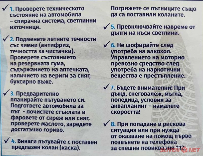 Задължение на водачите е да подготвят автомобилите за движение при зимни условия - смяната на гумите, изправността на светлините, чистачките, антифриза, горивото при пътуване на далечни разстояния и необходимостта от оборудване с вериги.