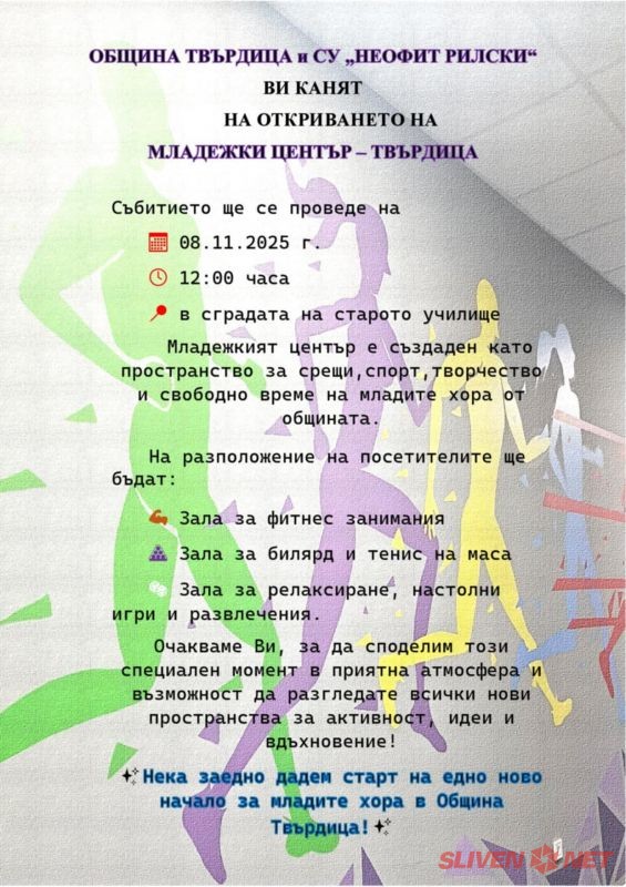 На 8 ноември 2025 г. (събота) от 12:00 ч., в сградата на старото училище в Твърдица ще бъде открит новият Младежки център, създаден по инициатива на Община Твърдица и СУ „Неофит Рилски“.
