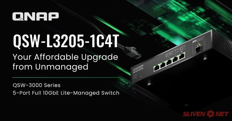 QNAP® Systems, Inc. анонсира пазарния дебют на новия 5-портов, изцяло 10GbE Lite-managed комутатор. Моделът QSW-L3205-1C4T разполага с четири 10GbE мулти-Gigabit RJ45 порта и един 10GbE SFP+/RJ45 комбо порт. Той предоставя максимална мрежова производителност на минимална цена и е най-икономичният избор за малки отдели и студиа за ъпгрейд от неуправляеми към Lite-Managed комутатори.