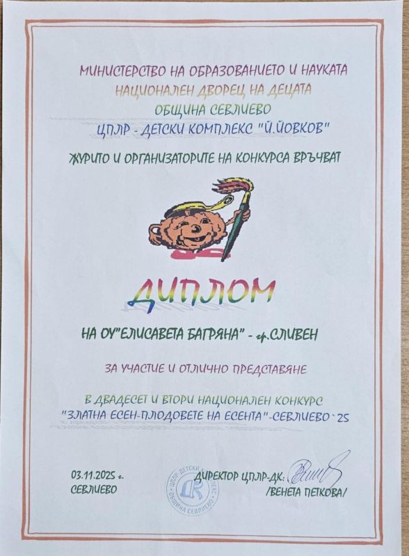 Успех за ОУ „Елисавета Багряна“ – Сливен в Националния конкурс „Златна есен – плодовете на есента“