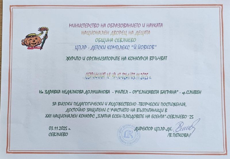Ученици и техният преподавател от ОУ „Елисавета Багряна“ – град Сливен постигнаха поредно признание в XXII Национален конкурс „Златна есен – плодовете на есента“, организиран от ЦПЛР – Детски комплекс „Й. Йовков“, Севлиево, под егидата на Министерството на образованието и науката и Националния дворец на децата.