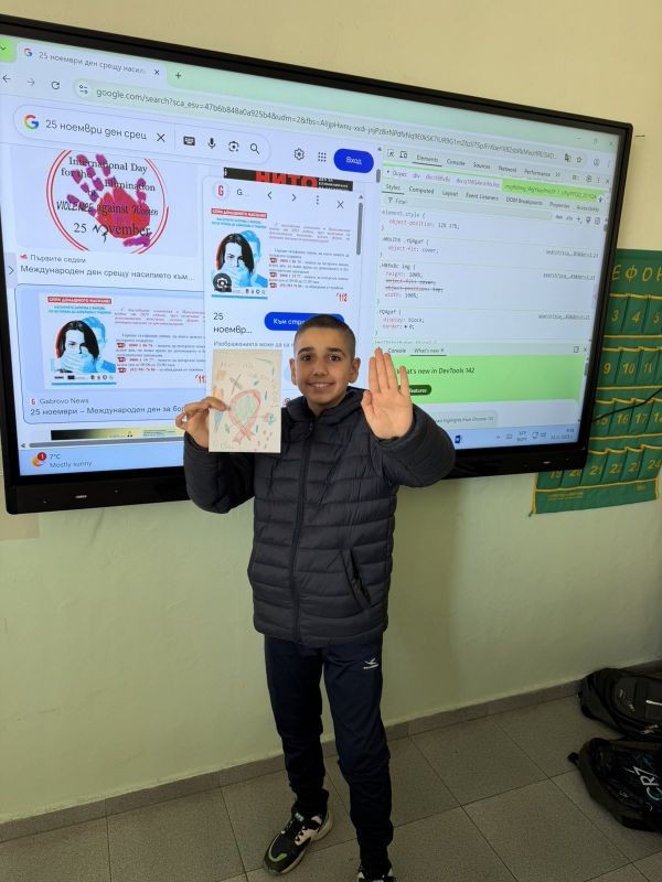 Международният ден за елиминиране на насилието срещу жени, обявен с Резолюция 54/134 на ООН през 1999 г., бе отбелязан и в нашето училище. В навечерието на 25 ноември учениците от 5а, 5б и 7а клас посветиха последните 20 минути от часа по Изобразително изкуство на дискусия по темата, проведена чрез електронна урочна единица. Поводът за датата е трагичната история на сестрите Мирабал, чиято гибел през 1961 г. поставя началото на глобалната борба срещу насилието над жени.