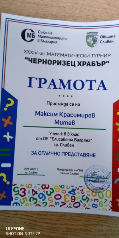 Максим Митев от III “г“ клас се класира на четвърто място и получи грамота за отлично представяне.