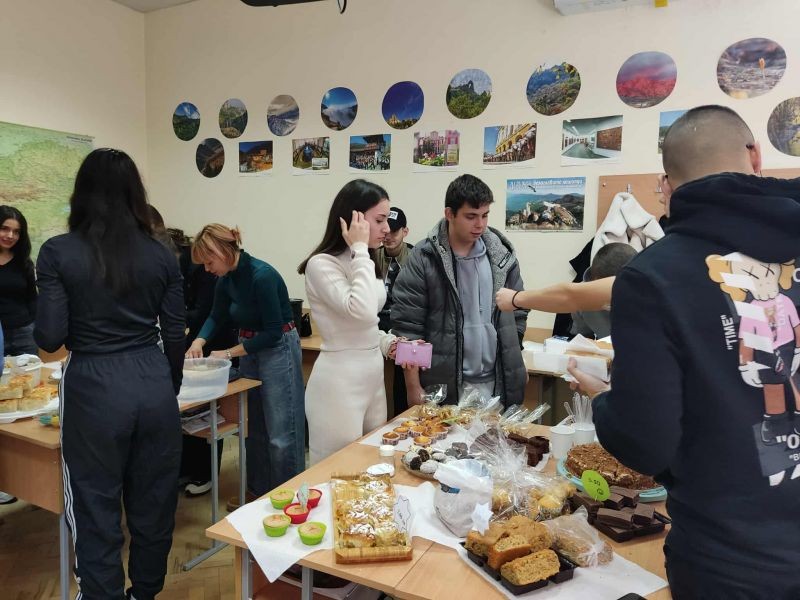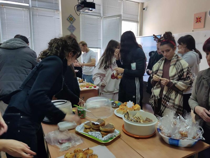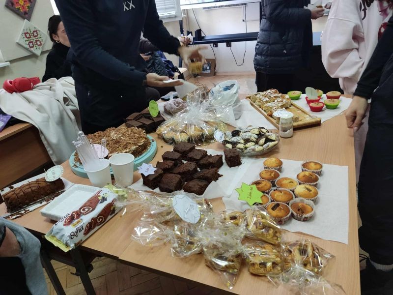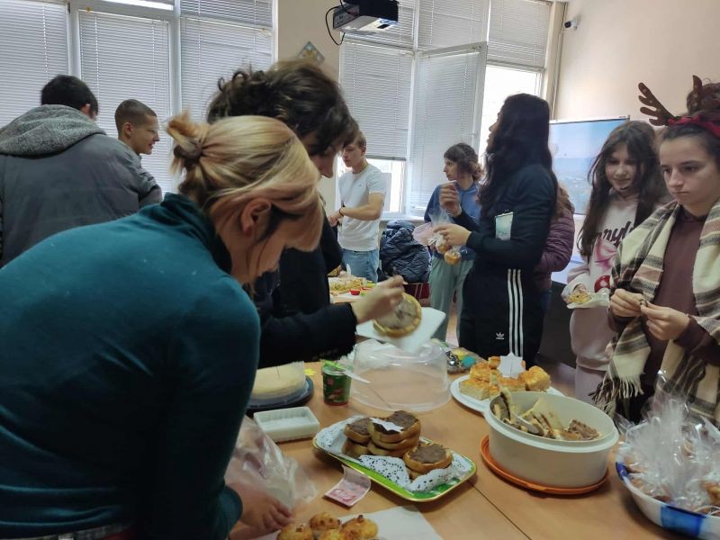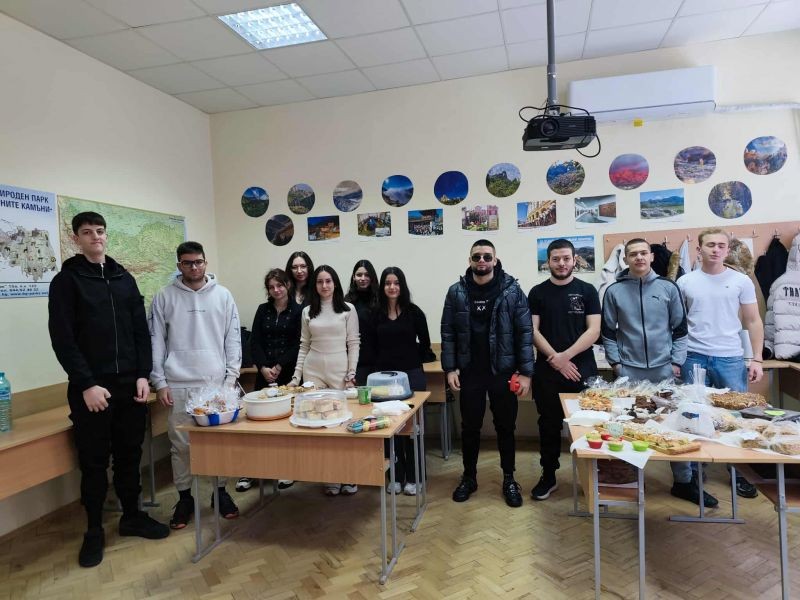 Учениците от XIIб клас в Хуманитарна гимназия „Дамян Дамянов“ организираха днес – на 2 декември, Щедър вторник. В класната си стая те проведоха благотворителен базар за домашни сладки и солени изкушения, в който се включиха съучениците им от цялото училище.