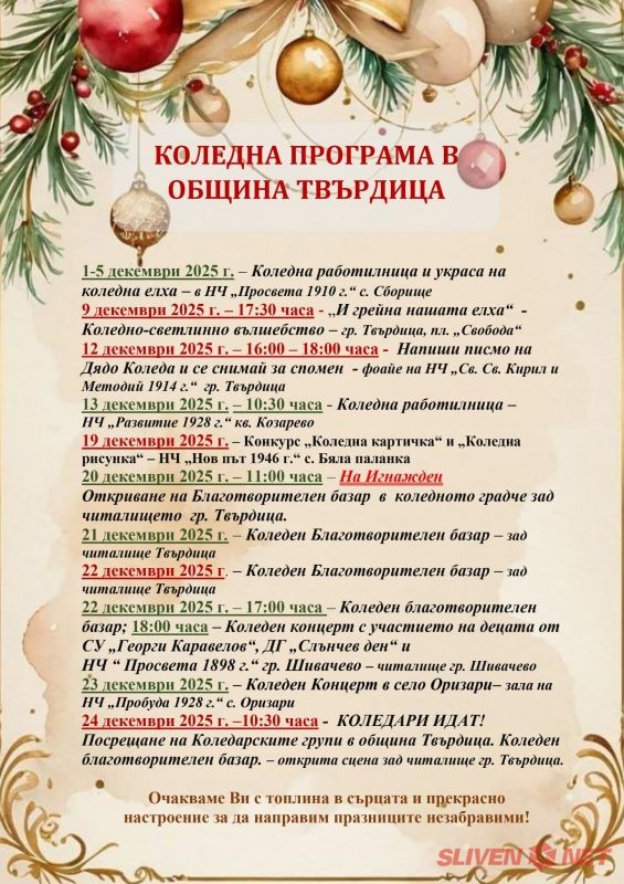 Община Твърдица кани всички жители и гости да станат част от празничните събития и заедно да посрещнат Коледа 2025 с надежда, благодарност и топлина.