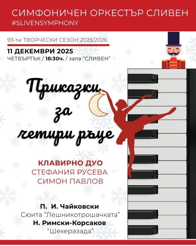 В навечерието на Коледните и новогодишни празници, най-магичното време на годината, младите пианисти Стефания Русева и Симон Павлов , ще разкажат любимата коледна история за „Лешникотрошачката“ и четири от приказките на „Шехеразада“. Камерният концерт „Приказки за четири ръце“ ще зарадва жителите и гости на Сливен в четвъртък, 11 декември, от 18.30 ч. в зала Сливен.