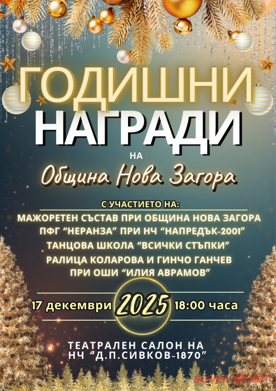Община Нова Загора има удоволствието да покани жителите и гостите на града на тържествената церемония „Годишни награди на Община Нова Загора“, посветена на хората с принос за развитието и утвърждаването на местната общност.