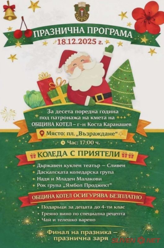 В средата на тази седмица Котел отново ще се изпълни с топлина, усмивки и празнично настроение. По покана на кмета на Община Котел – г-н Коста Каранашев, жителите и гостите на града са добре дошли на поредното издание на празника „Коледа с приятели“ – най-задушевния празник, който Общината организира вече десет години в навечерието на коледно-новогодишните празници.