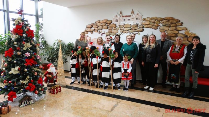 Облечени в тежки ямурлуци, с дървени геги и гиздави калпаци, децата представиха истински празничен спектакъл с красиви коледни песни и традиционни наричания. Техните учители поднесоха на кмета на Общината – г-жа Галя Захариева, вкусна обредна питка, символ на здраве, берекет и благоденствие за целия град.
