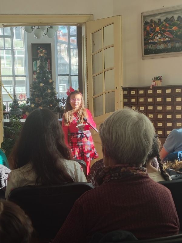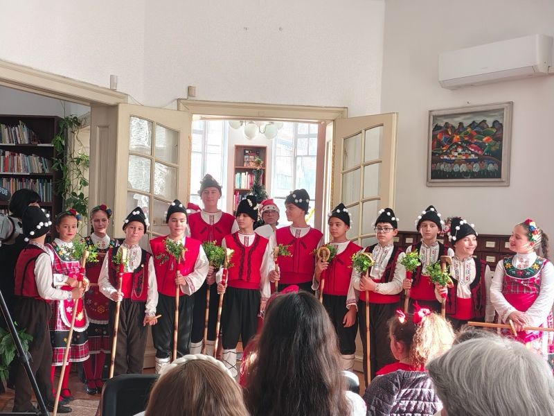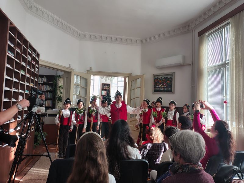 По-късно учениците от ОУ „Елисавета Багряна“ се включиха в тържествената програма по награждаването на отличените участници в конкурса за коледна картичка, организиран от Регионална библиотека „Сава Доброплодни“. Там фолклорът отново намери своя глас – чист, детски и искрен.