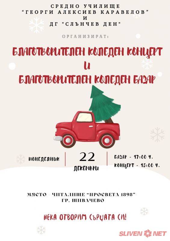В навечерието на най-светлия християнски празник – Рождество Христово, Средно училище „Георги Алексиев Каравелов“, съвместно с ДГ „Слънчев ден“, организират Коледен благотворителен концерт и Коледен благотворителен базар, обединени от една обща кауза – да подадем ръка на човек в нужда.