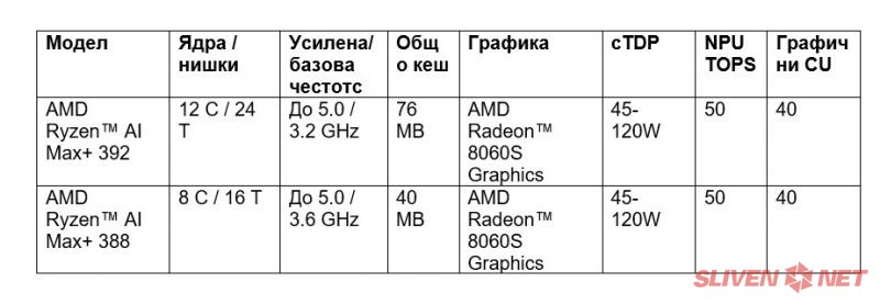 AMD обяви Ryzen AI Max+ 392 и Ryzen AI Max+ 388, нови попълнения към серията Ryzen™ AI Max+, които предоставят високопроизводителни AI изчисления, интегрирана графика от настолен клас и унифицирана архитектура на паметта на първокласни ултратънки лаптопи, работни станции и компактни мини-компютри. Процесорите Ryzen AI Max+ позволяват на производителите на оригинално оборудване (OEM) да доставят Copilot+ компютри, оптимизирани както за взискателни творчески и AI натоварвания, така и за завладяващ геймплей, без да се прави компромис с преносимостта или потребителското изживяване.