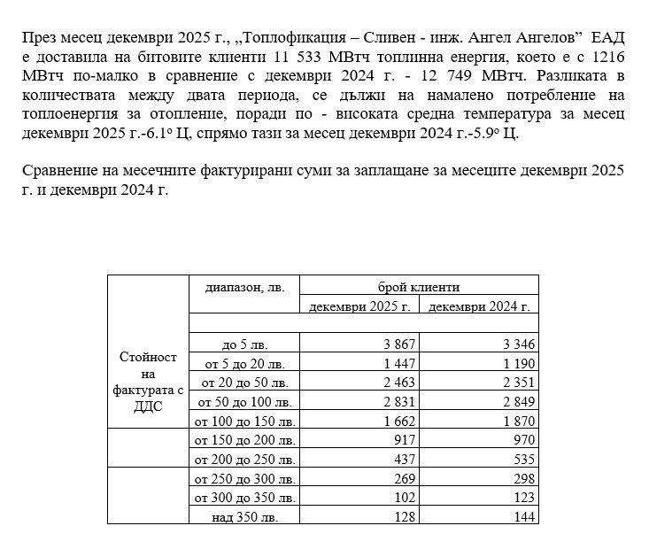 Анализ на потреблението през месец декември 2025 г. на клиенти на „Топлофикация-Сливен-инж.Ангел Ангелов” ЕАД