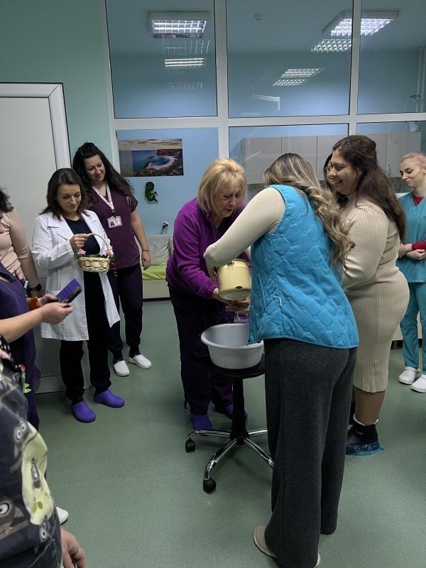 Рано тази сутрин - на Бабинден, целият екип участва в традиционния ритуал „миене на ръце“ по повод Деня на родилната помощ – 21 януари. Бяха измити ръцете на д-р Диана Гугова и след това на останалите лекари. Персоналът и родилките от всички стаи в отделението, бяха поръсени за здраве със светена вода.