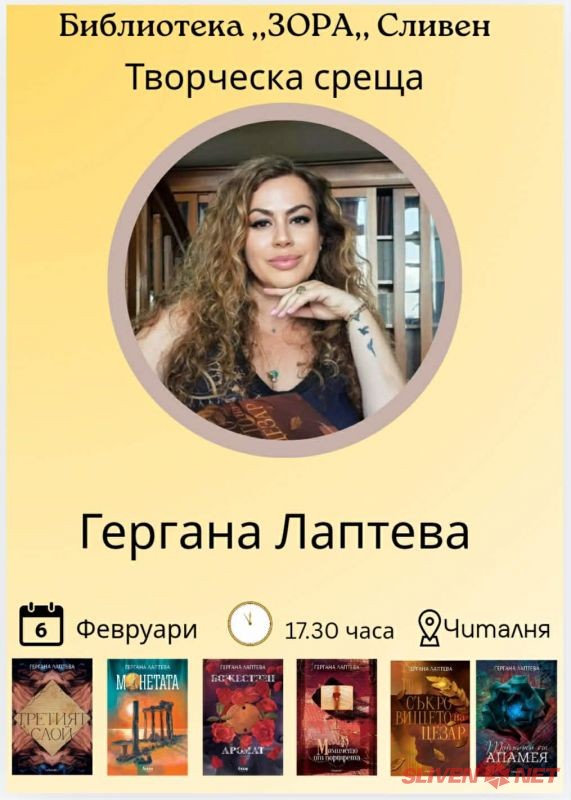 Библиотека „Зора“ – Сливен кани всички любители на литературата на творческа среща с българската писателка Гергана Лаптева, която ще се състои на 6 февруари 2026 г. от 17:30 часа в сградата на библиотеката на пл. „Хаджи Димитър“ №1.