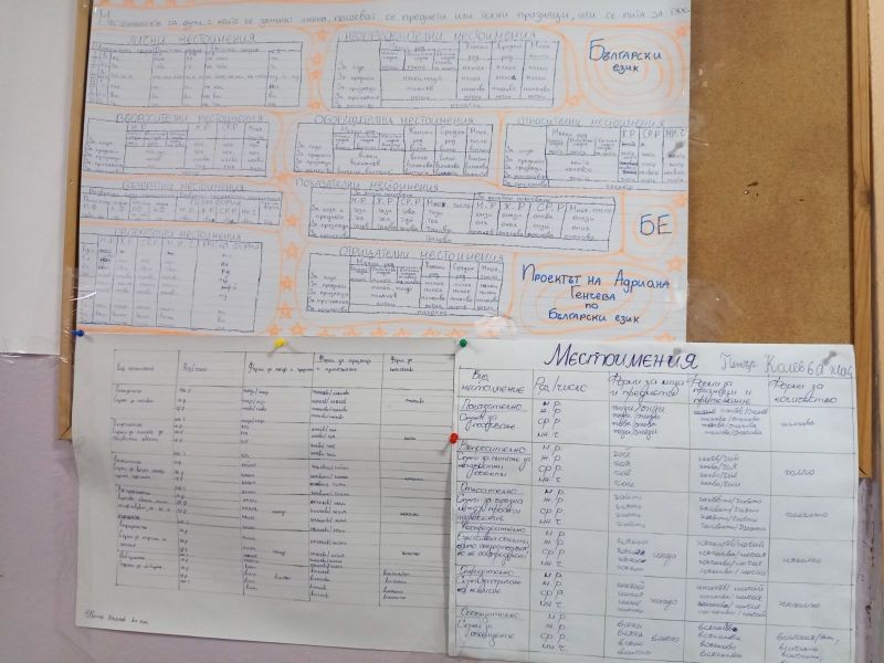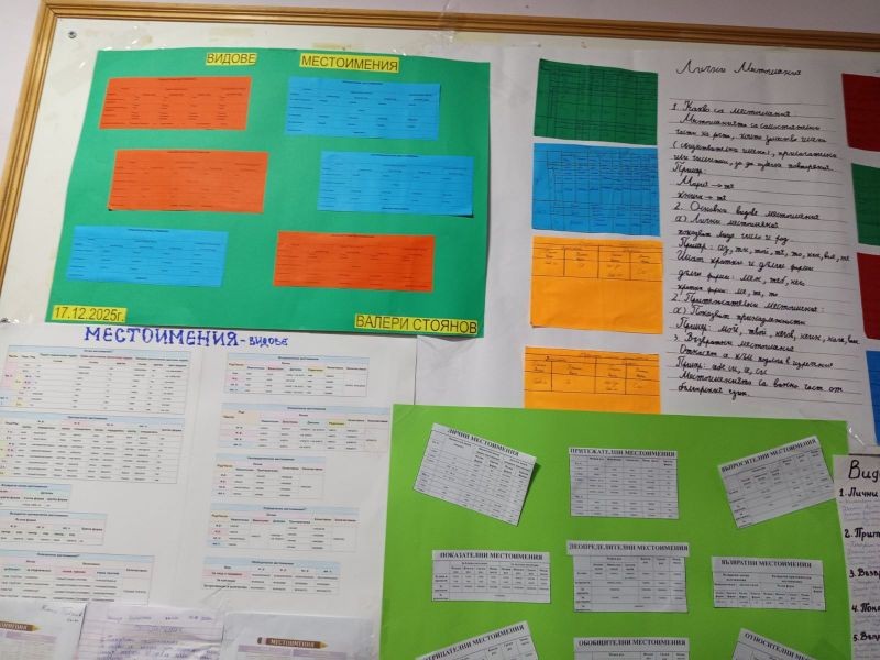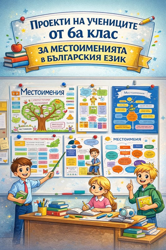 Учениците от 6 а клас подготвиха свои проекти по темата "Местоимения, изучавани в 5. и 6. клас". Тя бе поставена от Нели Димитрова, учител по БЕЛ и класен ръководител на шестокласниците. С много старание, с припомняне на изученото миналата година и допълнено с новите знания за местоименията от тази учебна година, шестокласниците изпълниха заданието. В часовете по български език приложиха на практика наученото по сложната граматическа тема.