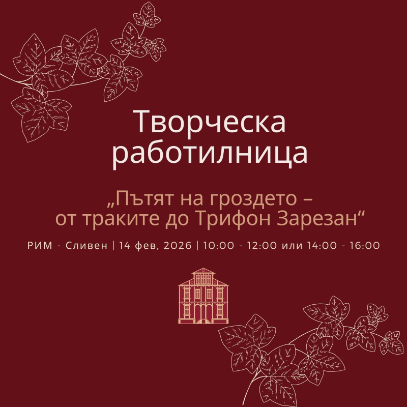 Творческата работилница „Пътят на гроздето – от траките до Трифон Зарезан“ ще се проведе на 14 февруари 2026 г., събота, в сградата на Регионален исторически музей "Д-р Симеон Табаков" - Сливен от 10:00 до 12:00 ч. и от 14:00 до 16:00 ч.