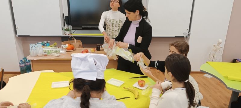 • От теория към практика: Учениците научиха как лесно да заменят вредните междинни закуски с пресни плодове и салати и как сами могат да си приготвят вкусна и здравословна закуска за голямото междучасие.
