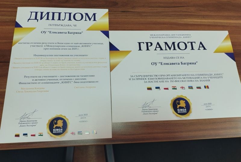 ОУ "Елисавета Багряна" - Сливен беше отличено за постигнати високи резултати и активно участие в Международната дистанционна ученическа олимпиада „КИНГС“ – есенен сезон 2025 г.