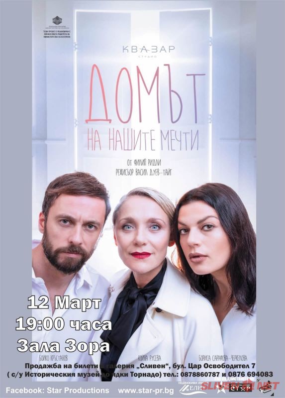 На 12 март (четвъртък) от 19:00 часа в зала „Зора“ ще се състои гостуващият спектакъл „Домът на нашите мечти“ от британския драматург Филип Ридли. Постановката е режисирана от Васил Дуев-Тайг и събира на сцената популярните актьори Бойко Кръстанов, Бориса Сарафова-Черкелова и Койна Русева.