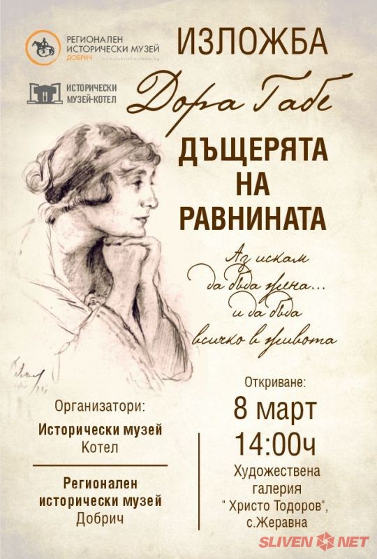Исторически музей – Котел и Регионален исторически музей – Добрич канят жителите и гостите на общината на официалното откриване на гостуващата фотодокументална изложба „Дора Габе – дъщеря на равнината“. Събитието ще се състои на 8 март – Международния ден на жената, от 14:00 часа в Художествена галерия „Христо Тодоров“ в село Жеравна.