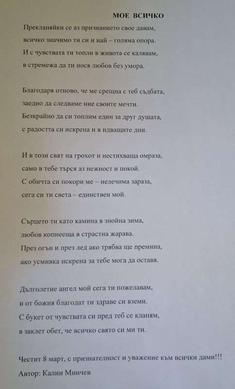 И тази година инж. Калин Минчев от отдел „Техническа инфраструктура“ посвети своя лирика на дамите от община Сливен по случай Осми март. Авторът на стихотворението „Мое всичко“ поздравява нежната половина на човечеството с пожелание за здраве, щастие и да се чувства благословена от Господ. Към дамите той се обръща с признателност и уважение.