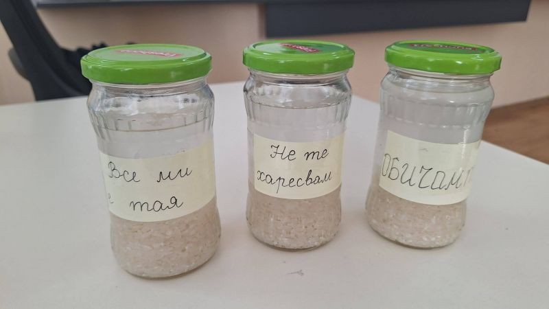 Децата направиха опит с три буркана, пълни с вода и ориз, като върху тях написаха „Обичам те“, „Не те харесвам“ и „Все ми е тая“. В продължение на няколко седмици учениците всеки ден изричаха съответните думи към всеки буркан и наблюдаваха промените.