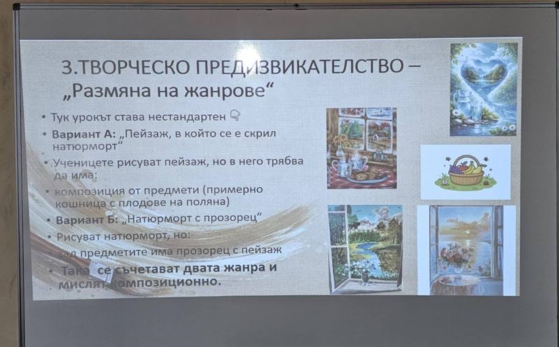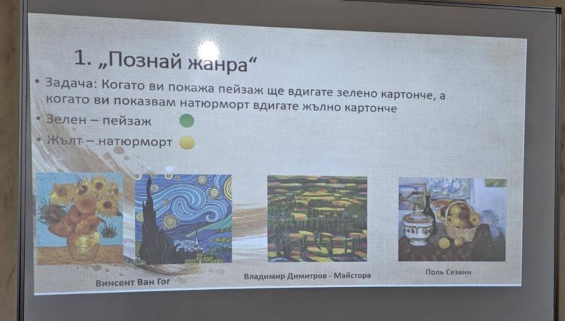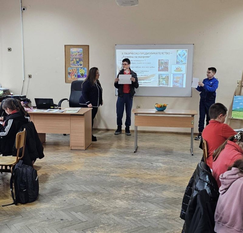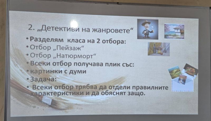 Урокът протече с разнообразни интерактивни методи – беседа, игра, демонстрация, творческо предизвикателство и работа в екип. Особен интерес предизвикаха игрите „Познай жанра“ и „Детективи на жанровете“, в които учениците активно участваха, анализираха изображения и аргументираха своите отговори.
