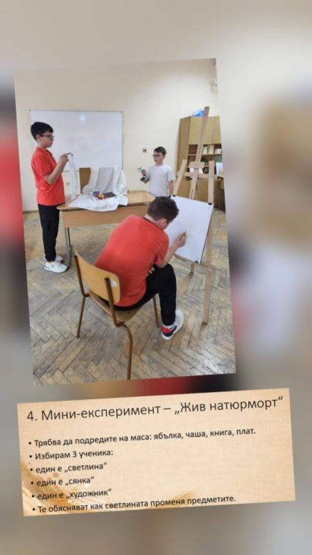 В творческото предизвикателство „Размяна на жанрове“ те съчетаха двата жанра в една композиция, като проявиха въображение и креативност. Голям интерес предизвика и мини-експериментът „Жив натюрморт“, при който учениците влязоха в роли на „светлина“, „сянка“ и „художник“, за да открият как светлината влияе върху възприятието на предметите.