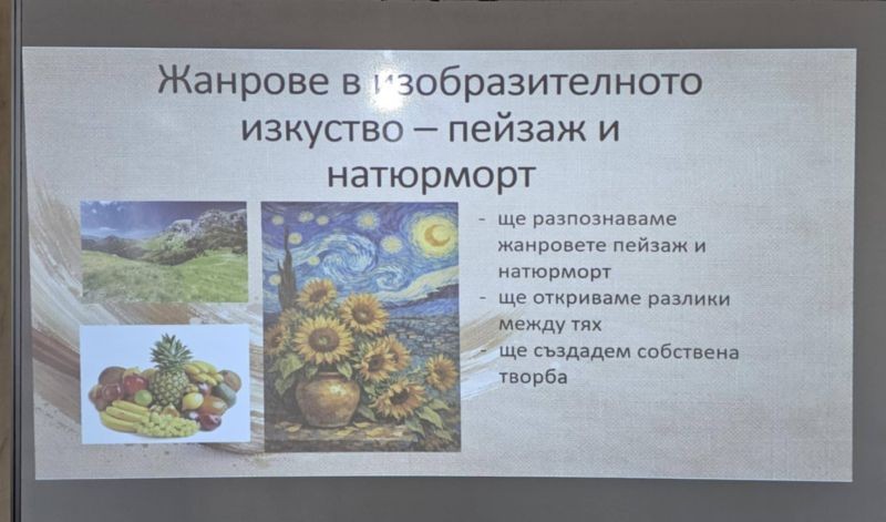 Темата на урока – „Жанрове в изобразителното изкуство – пейзаж и натюрморт“ – беше представена чрез съчетание на нови знания и активна практическа дейност. Още в началото учениците бяха въведени в темата чрез въпроси и визуален анализ, които провокираха тяхното мислене и ги насочиха сами да открият особеностите на двата жанра.