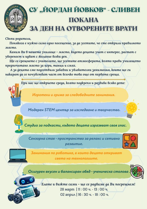 СУ „ЙОРДАН ЙОВКОВ“ – СЛИВЕН ОРГАНИЗИРА ДНИ НА ОТВОРЕНИТЕ ВРАТИ