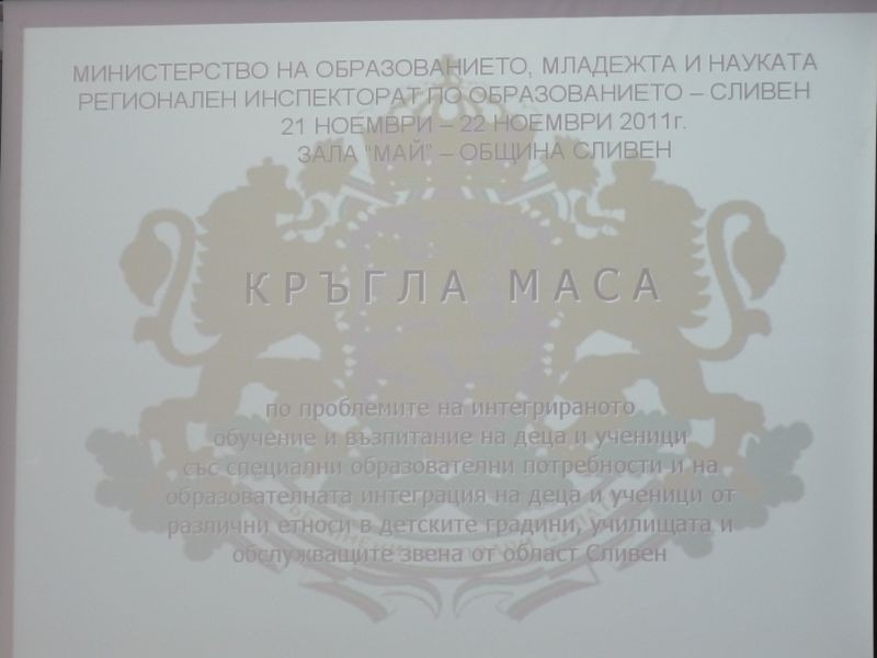 На 21.11.2011 г. в зала „Май” на Община Сливен, се откри Кръгла маса по проблемите на интегрираното обучение и възпитание на деца и ученици със специални образователни потребности и деца с различна етническа принадлежност. Мероприятието е инициирано от Регионален инспекторат по образованието – гр. Сливен.