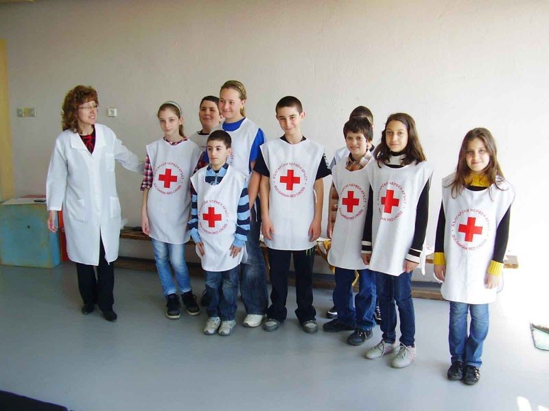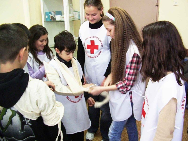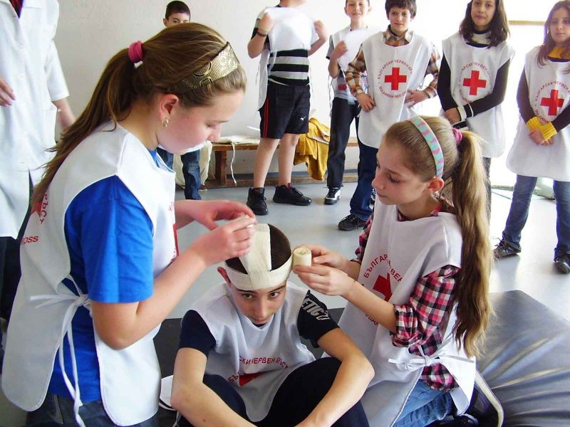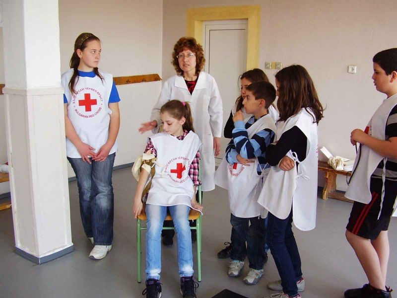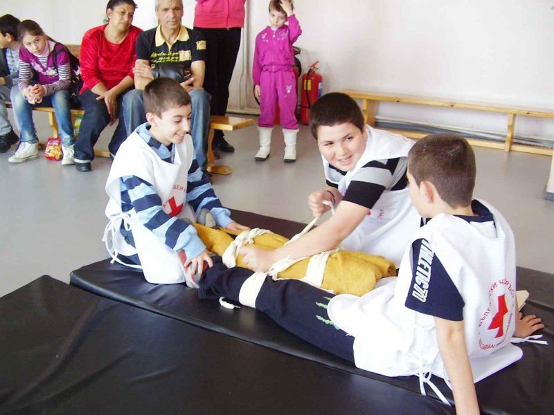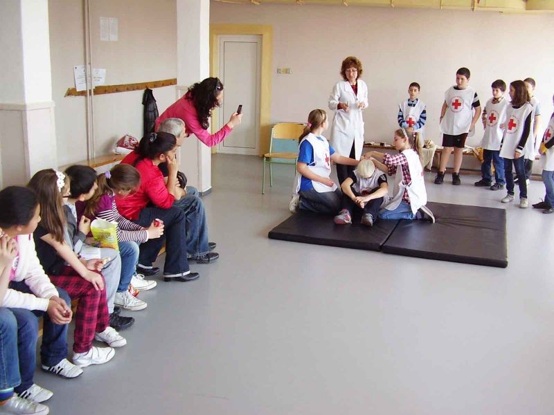 Учениците от секция „Скаутски лагер – първа помощ” показаха пред по-малките ученици и своите родители как се дава първа помощ при ПТП. Малките червенокръстци извадиха пострадал от автомобил, дадоха му първа помощ. След това спасиха мотоциклетист. Показаха как се спират различни видове кръвоизливи със стандартни и подръчни материали. Шинираха крайници и бинтоваха рани.