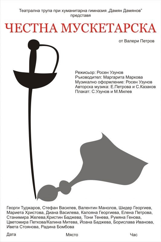 На 4 април /сряда/ от 19.00 ч в зала „Зора” Театралната трупа при ХГ “Дамян Дамянов” ще представи музикално-поетичния спектакъл “Честна мускетарска ” от Валери Петров.