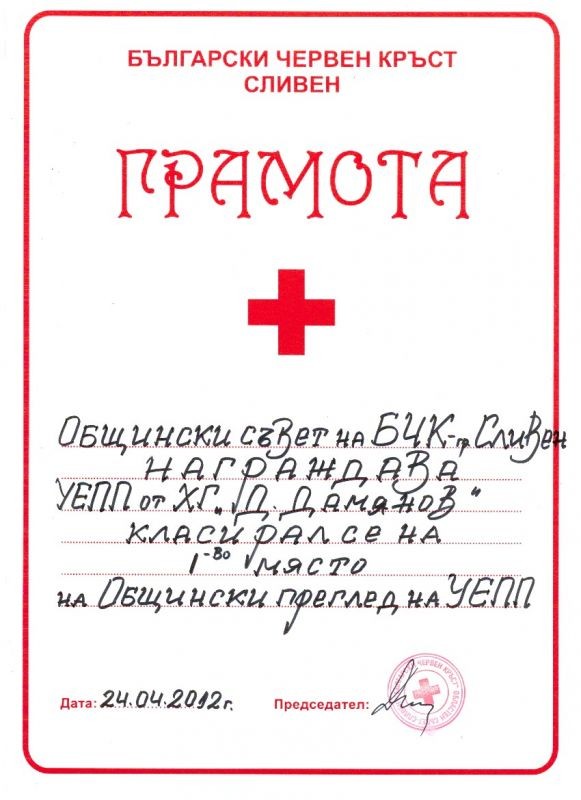 ПРИЗОВИ МЕСТА ПО ПЪРВА ПОМОЩ ЗА ОТБОРИТЕ НА ХУМАНИТАРНА ГИМНАЗИЯ „Д. ДАМЯНОВ”