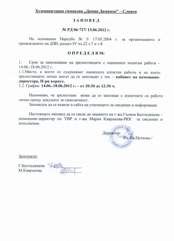 Уважаеми зрелостници, всеки желаещ да се запознае с оценената си работа, може да направи това от 14 юни до 18 юни 2012 г. във втори корпус на Гимназията от 10:30 до 12:30 ч. срещу документ за самоличност.