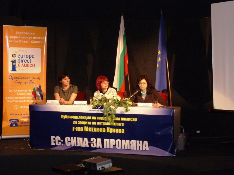 Eвропейският комисар за защита на потребителите Меглена Кунева беше в Сливен, за да участва в среща-дискусия на тема „Европейският съюз – сила за промяна”, която се състоя вчера – 18 февруари, в камерната зала на Драматичен театър „Ст. Киров” в Сливен. Проявата бе организирана от Представителството на Европейската комисия в България, Областния управител на област Сливен, кметът на Община Сливен и Информационен център Europe Direct – Сливен. Тя е част от действията на г-жа Кунева за повишаване информираността на гражданите по европейските въпроси.