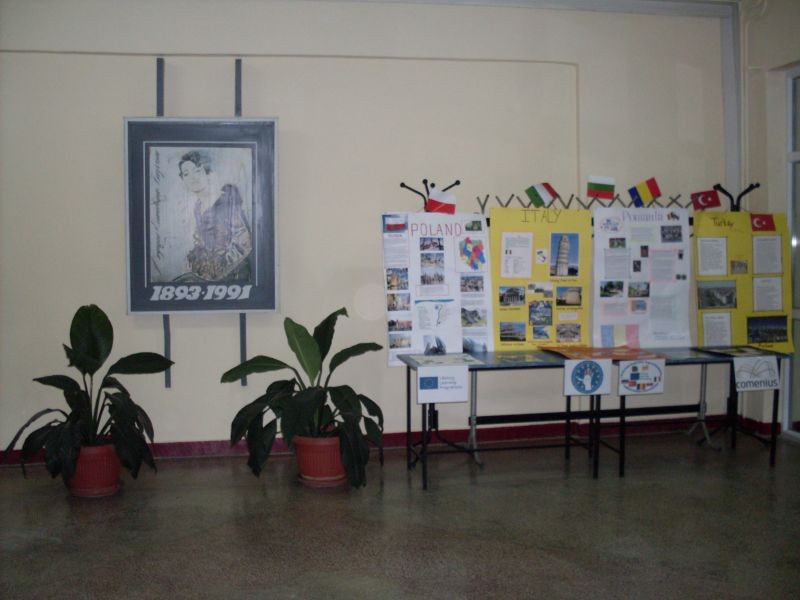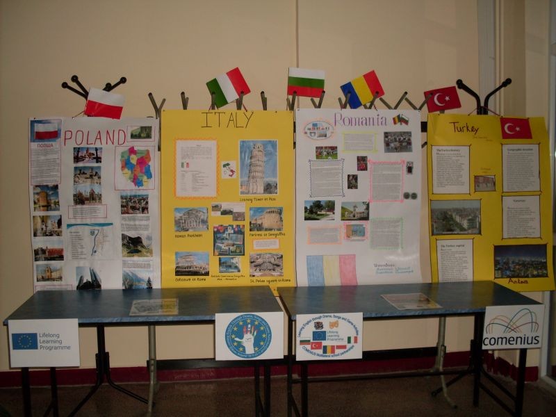 Уреден бе кът "Коменски" с плакати, изработени от учениците от VI и VII клас за Полша, Румъния, Италия и Турция и партньорските градове и училища.