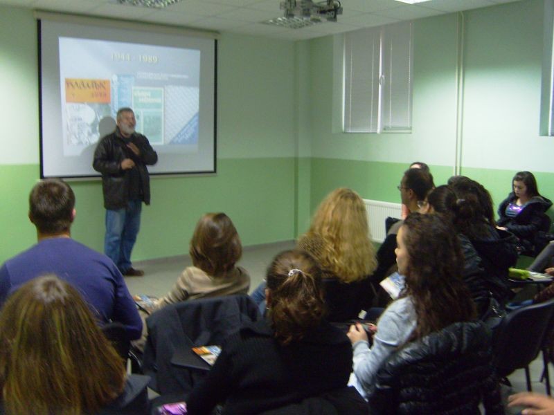 На 20.11.12 г. от 12:30 часа в мултимедийната зала в Хуманитарна гимназия „Дамян Дамянов” се проведе среща на ученици от трите профилирани гимназии ПМГ „Добри Чинтулов”, ГПЗЕ „Захари Стоянов” и ХГ „Дамян Дамянов” с представители на редакционната колегия на списание „СТРАНИЦА”. Поетът Недялко Славов и ученият Младен Влашки (преподавател в ПУ „Паисий Хилендарски”) ентусиазираха младата публика популяризирайки сериозното, некомерсиалното, националното списание за съвременна българска литература.