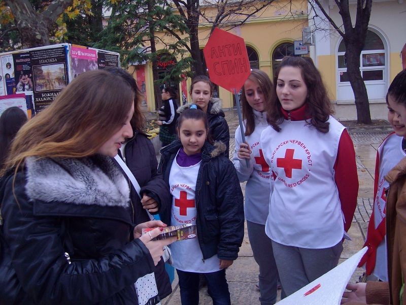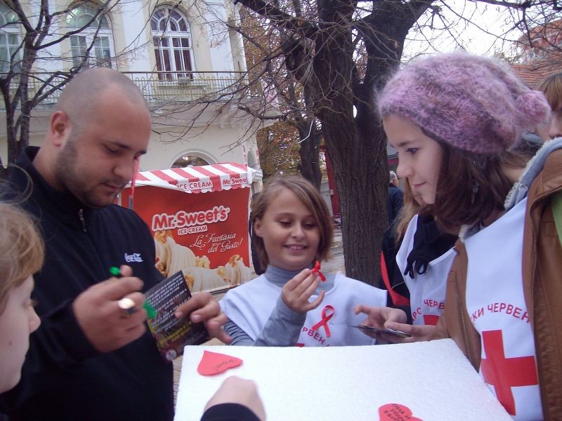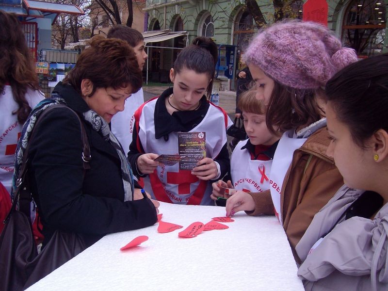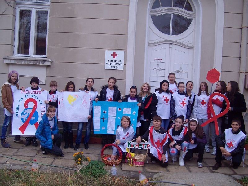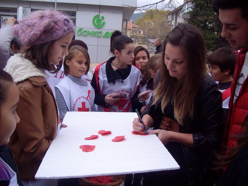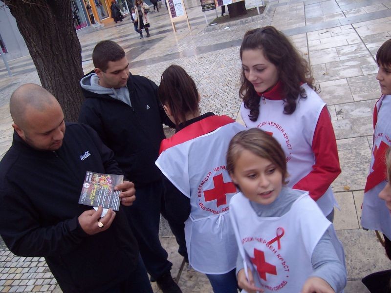 И тази година доброволците от клуб „Безвъзмездна помощ” при Хуманитарна гимназия към БМЧК се включи активно в кампанията - с изработените от нас плакати, с разпространяването на информационни брошури „ПРЕГРЪДКАТА НЕ УБИВА. ДИСКРИМИНАЦИЯТА - ДА!”,със символа - червената лентичка.