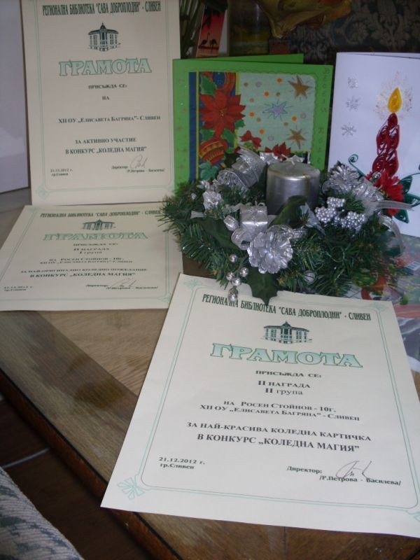 Учениците от XII ОУ „Ел. Багряна” участваха в национален конкурс „Коледна магия” за коледна картичка и пожелание, организиран от РБ „Сава Доброплодни” – гр. Сливен. Наградените ученици са:
